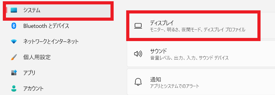 「システム」を選んだあと、「ディスプレイ」を選択します。