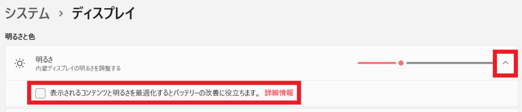 「表示されるコンテンツと明るさを最適化するとバッテリーの改善に役立ちます」という欄の左にあるチェックボックスを外します。
